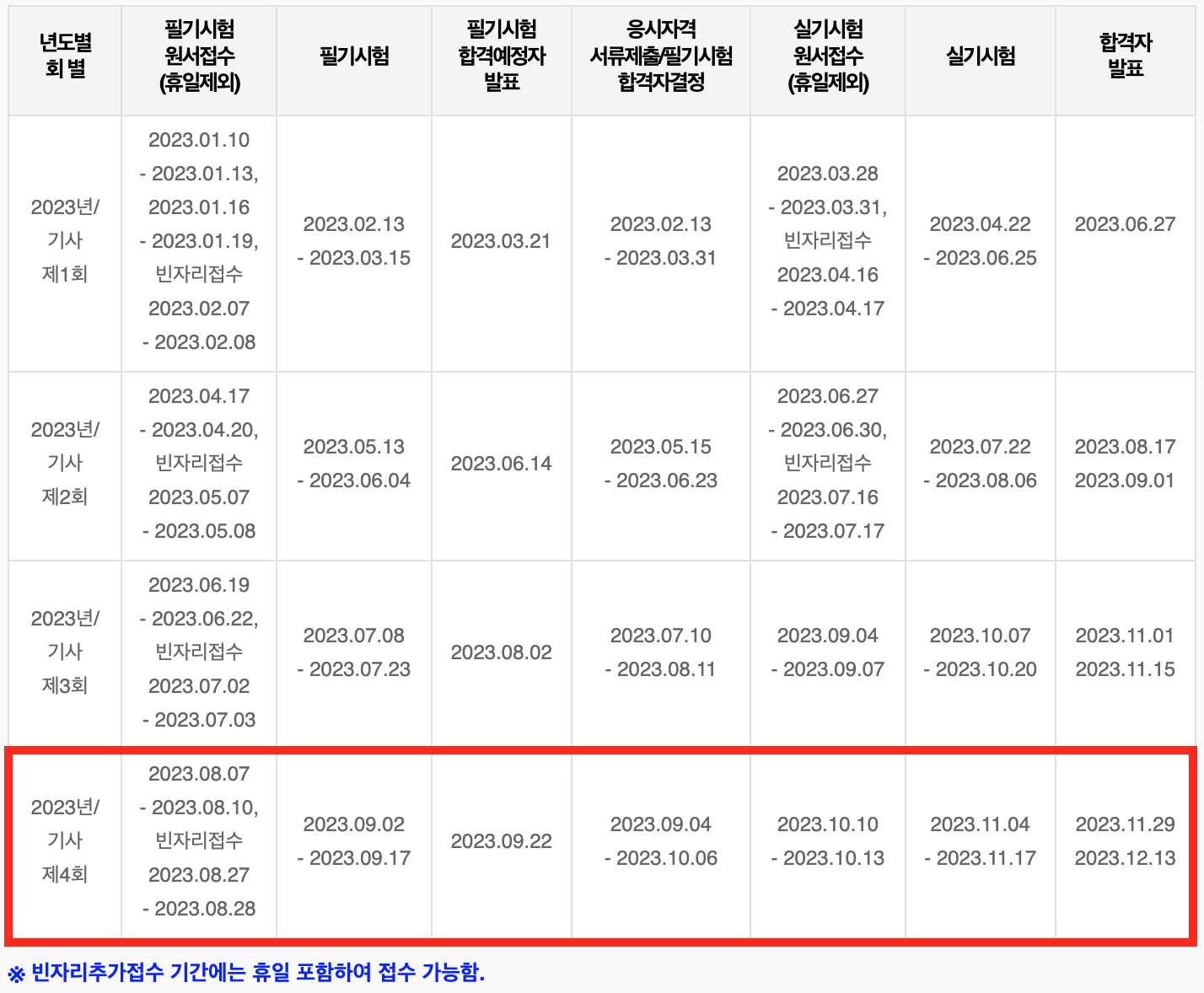 2023년 제4회 국가기술자격 정기 기사일정을 알아봅시다. 필기접수가 이번에 있으니, 시험에 응시하려고 했던 분들은 모두 놓치지 말고 꼭 응시하시길 바랍니다. 2023년 마지막 정기 기사시험이니 모두 화이팅하세요! 만약 이번주에 필기시험접수를 놓치신 분은 아래 일정을 보시면, 추가 접수기간도 있으니 꼭 확인하세요.
